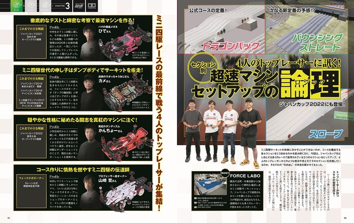 タミヤの公式レースに出走するためのレギュレーション解説をはじめ、ミニ四駆を走らせて楽しみたい人は必見。また、ジャパンカップで上位入賞経験のあるトップレーサーに取材を行い、それぞれの持論を深掘り。難セクションの攻略法も惜しみなく公開してくれました。