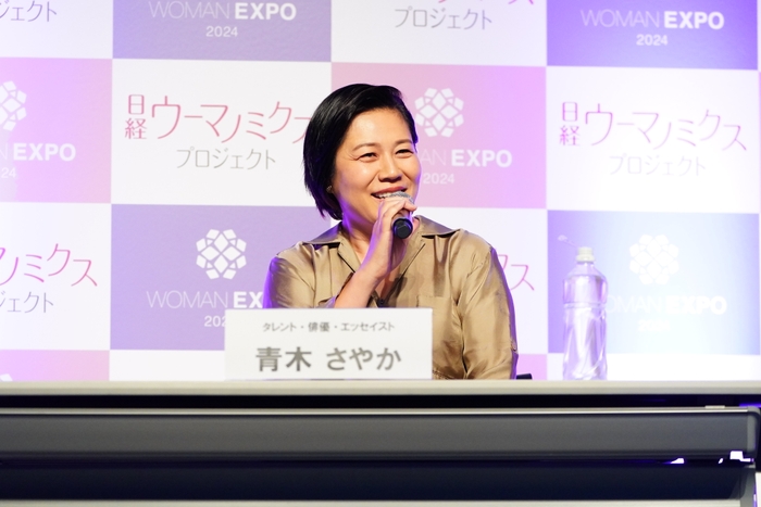 最初に行われたセミナー「⻘⽊さやかのマネー道場 ザ・リアル」には、「日経WOMAN」で「青木さやかのマネー道場」を連載中の青木さやかとファイナンシャルプランナー坂本綾子が登壇。青木は自己紹介で「ちょっとどこ見てんのよ!」と自らのギャグで会場を和ませると、その後も軽快なトークを展開。連載を通じて気付いた自分自身の“いいお金の使い方”“悪いお金の使い方”、初めての「ふるさと納税」など、マネーにまつわるさまざまなエピソードを明かしました。今後は話題の「新NISA」にも挑戦し、その過程を連載にて公開していきます。