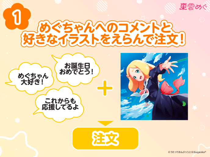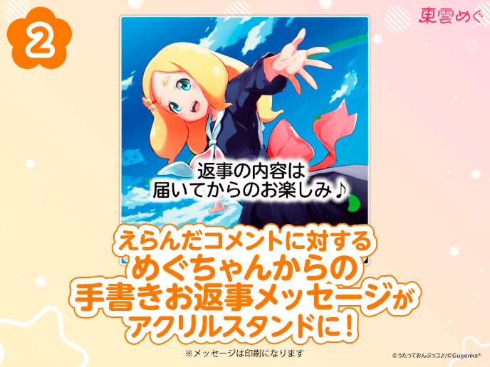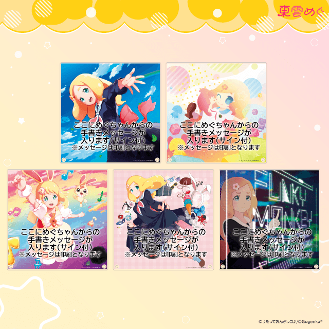 好きな背景イラスト(5種)と、めぐちゃんに送りたいコメント(3種)を選んで注文すると、選んだコメントに対するめぐちゃんからの手書きお返事メッセージが載ったアクリルスタンドが届きます(メッセージ、サインは印刷となります)。メッセージの内容は届いてからのお楽しみ。選べるイラストはこれまでリリースされた楽曲のジャケットなど5種。透け感のある大判のアクリルスタンドで、めぐちゃんからのメッセージをいつでも飾って楽しめます。予約受付期間は2020年4月10日〜2020年4月27日となります。