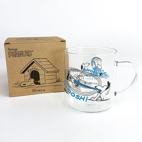 スヌーピーとライナスの楽しいデザインがかわいい、ガラスマグです。透明なガラスのクリア感に、ライナスのブルーのブランケットが映えています♪引っ張り合っているイラストもかわいくて、思わずクスっとしてしまいますよね。
