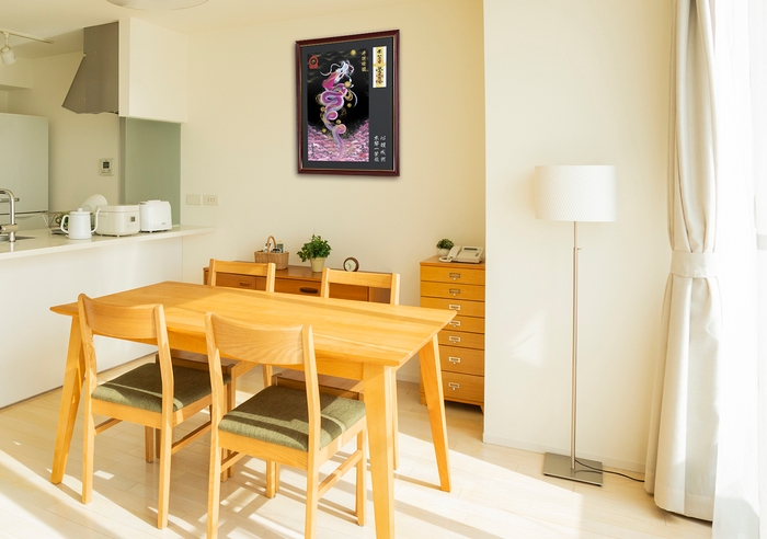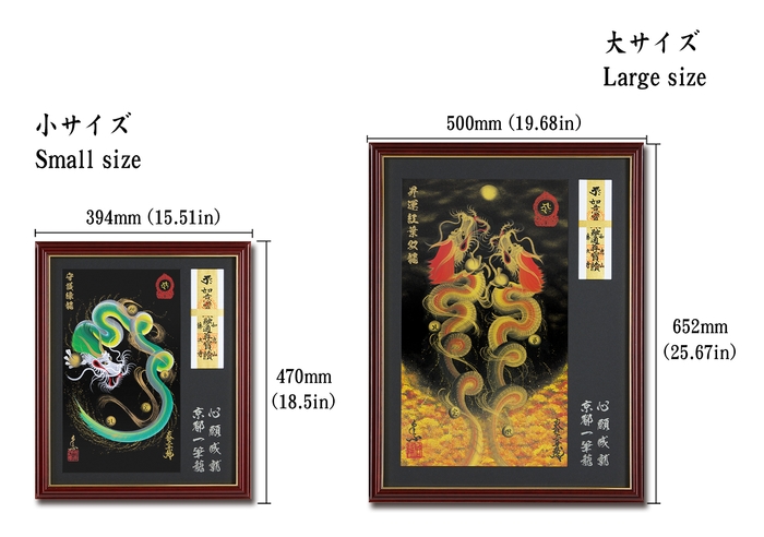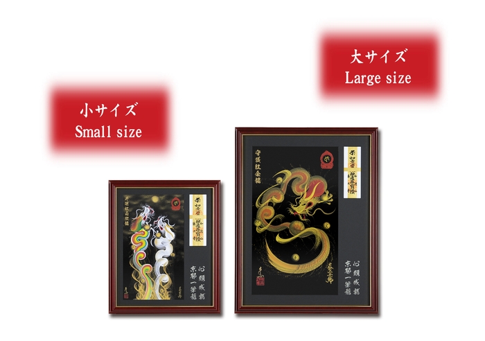 落ち着いた風合いの高級額縁(大小 サイズ2種)を使用し、様々な場所で京都一筆龍描画と御札(紙製)をお祀り(お飾り)いただけます