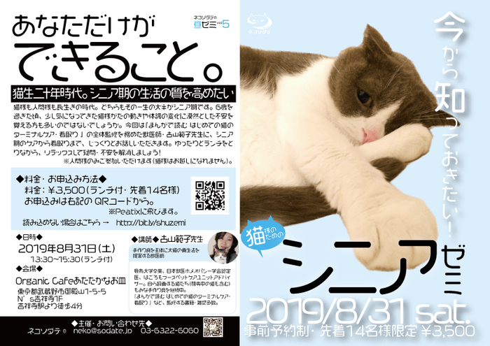 東京・西荻窪の猫用首輪・迷子札・猫雑貨の専門店「ネコソダテ」は、2019年8月31日(土)吉祥寺にて、猫様向けのシニアケア講座「今から始めたい!猫様のためのシニアゼミ」を開催します。
