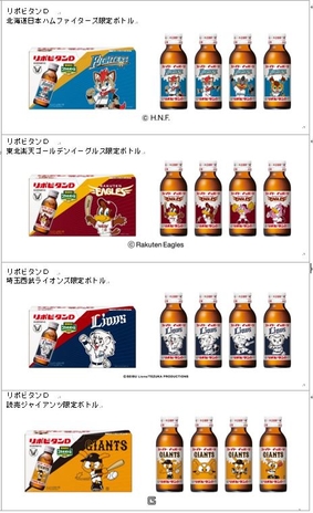 「リポビタンD プロ野球球団ボトル」は、2017年に第1弾を発売以来、毎年、プロ野球ファンの皆さんだけでなく、日頃よりリポビタンDをご利用いただいている皆さんにもご好評頂いている限定ボトルです。今年も各球団それぞれに、マスコットキャラクターやロゴをあしらった4種類の新しいデザインをご用意しました。