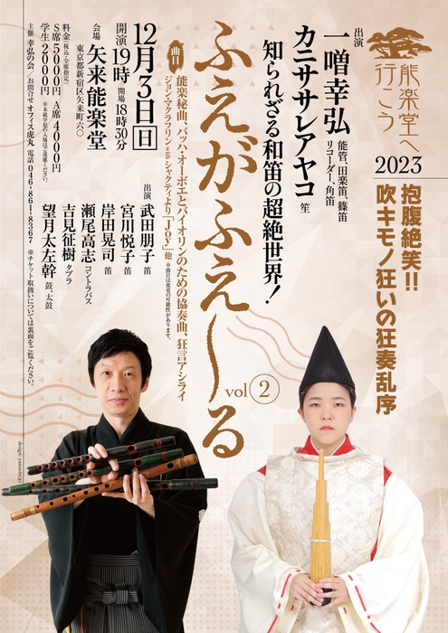 一噌幸弘の能楽堂へ行こう2023主催、『知られざる和笛の超絶世界!ふえがふえーる vol.2 ~抱腹絶笑!!吹キモノ狂いの狂奏乱序~』が2023年12月3日(日)に矢来能楽堂(東京都新宿区矢来町60)にて上演されます。