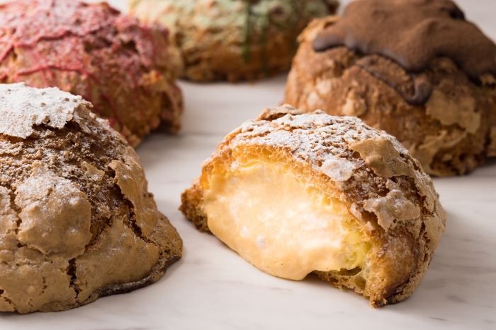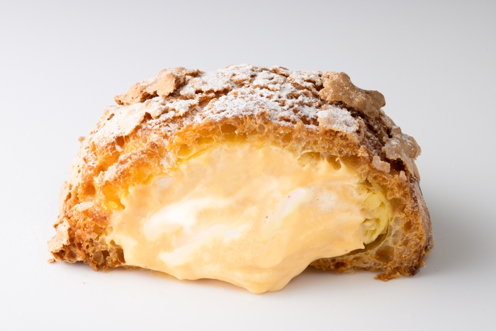 カスタードクリームには最高級バニラビーンズや地元の食材を使用、柑橘類の果汁を含む隠し味によって特徴づけをしており、甘さの中にほのかに柑橘の香りを感じます。また、カスタードクリームをシュー皮に入れる直前にホイップクリームとマーブル状に合わせることで、コクとキレをバランス良く両立させました。