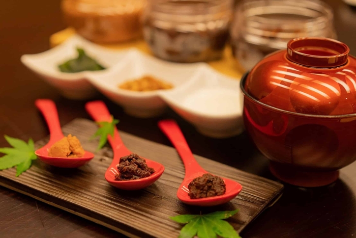 石井味噌には、一年味噌、二年味噌、三年味噌があり、それぞれ色や味わい、香りが全て異なります。界 松本での朝食時、石井味噌の3種類の味噌を自身で出汁に溶き、飲み比べながら味噌をブレンドし自分だけの一杯を堪能することができるのも特徴です。きのこや寒天など、長野県を代表するような具材と合わせ自分のお味噌の好みを発見しつつ、体温の低い朝の身体を自分だけの一杯で温めることができます。