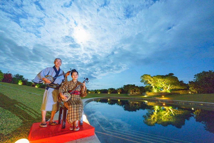 プールサイドで島の演者が三線を奏でます。八重山で旧暦8月13日に月の下で開催される民謡大会にちなみ、唄の島・芸能の島と呼ばれる八重山を代表する曲「とぅばらーま」を唄います。「とぅばらーま」は、恋人や故郷を思う気持ちを表現した曲で、島の唄い手により大切に歌い継がれてきた名歌です。静かな夜にしっとりと響く三線の音色と唄に耳を傾けながら、竹富島ならではの月見を堪能します。
