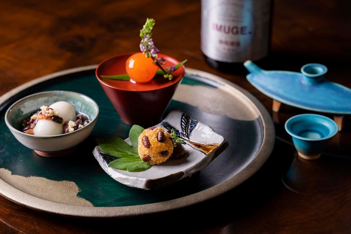 月夜を楽しむお供として、満月をイメージした形のおつまみと「幻の酒」と呼ばれるお酒を提供します。施設内で育てた小豆や芋を用いて作った小さなコロッケは、島で十五夜の際に食べられるフチャギ(赤豆餅)から着想を得ました。そのほか、満月をイメージさせる丸い形の黄身漬け、ぜんざいなども用意します。おつまみに合わせるお酒は、琉球王朝時代から約1世紀ぶりに離島の酒造蔵元が復活させた芋酒「IMUGE(イムゲー)」。ほのかに芋の甘みが感じられる蒸留酒です。優しい甘さが芋や小豆を使ったおつまみに合うだけでなく、月をゆっくりと愛でるひとときに寄り添う、飲みやすい味です。