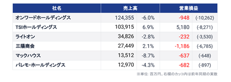 また、前年に赤字だった6社のうちTSIホールディングスは黒字転換し、他の5社も赤字幅が縮小している(表1から下表に抜粋)。