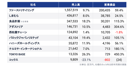 営業損益をみると、前年が黒字だった10社のうち、西松屋チェーンとコックスを除く8社が増益を果たした。しかし西松屋チェーンは1.8%の減益で、コックスは24百万円の黒字から802百万円の赤字に転落した(表1から下表に抜粋)。