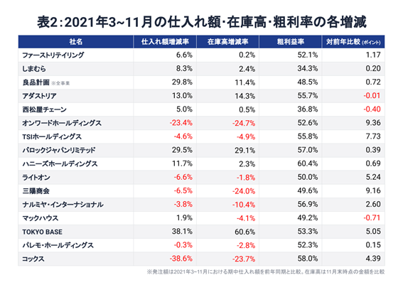 表2は各社の仕入れ増減率と11月末の在庫高増減率、粗利益率とその昨対比をまとめたものだ。
