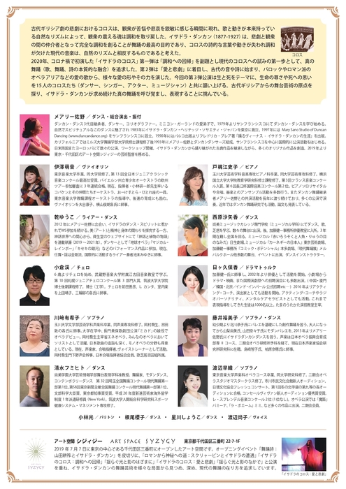 古代ギリシア劇の悲劇において観衆が苦悩や悲哀を鋭敏に感じる瞬間に現れる“コロス”は悲劇と観衆の間の仲介者として、観衆の震える魂に完全な調和を創る存在でした。古代ギリシアからの舞台芸術の原点を探り、現代において失われたコロスの詩的な言葉や動き、イサドラ・ダンカンが求め続けた真の舞踊を呼び覚まし、表現することに挑むシリーズの第3弾です。2020年コロナ禍で初演した「イサドラのコロス」第一弾は調和への回帰を副題とし、現代のコロスへの試みの第一歩として、真の舞踊(歌、舞踊、詩の本質的な融合)を追求、2021年の第2弾は愛と悲劇に着目し、古代の音や詩に始まり、バロックやロマン派のオペラアリアなどの愛の歌から様々な愛の形やその力を演じました。今回の第3弾公演は生と死をテーマに、生命の尊さや死への思いを17人のコロスたち(ダンサー、シンガー、アクター、ミュージシャン)が謳い上げる壮大な作品となります。