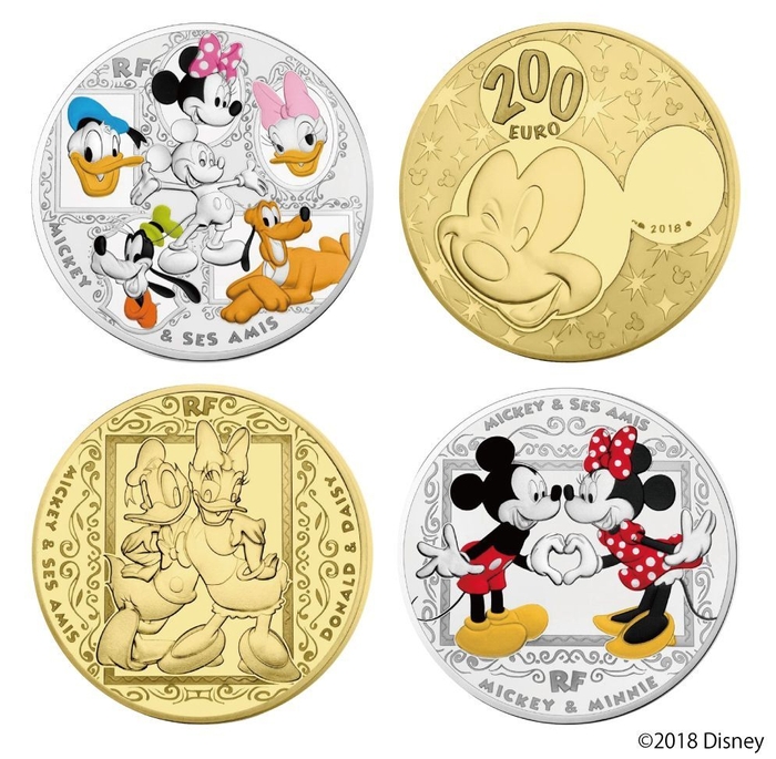 重量31.10グラムの200ユーロ金貨と、22.20グラムの10ユーロカラー銀貨の裏面には、ミッキーマウスとミニーマウスが描かれ、仲睦まじい二人が、お互いの手でハート型を作っています。