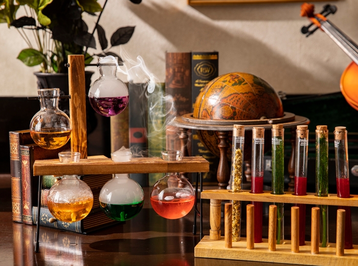 始業のチャイムが鳴ると、魔法使いの学校の門が開き、摩訶不思議な世界へとゲストをいざないます。魔術の本が山積みされた図書館や特別な生徒だけが入部を許される「魔女のオーケストラ」をイメージしたエリア、錬金術を学ぶ「魔法の実験室」や学生達が住む「魔法使いの寮」などを思わせる空間には、シェフによるマジカルスイーツと各種お食事が並び、エンターテイメント性あふれる秋のグルメ時間を予感させます。