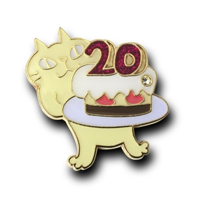 ピンズファクトリーのグリーティングカード“ピンズレター”でお馴染みのネコのキャラクターが20周年のお祝いのケーキを持っているイラストをピンズにしています。“20”の数字の部分にラメを施していつまでもキラキラと輝くピンズを製作しました。