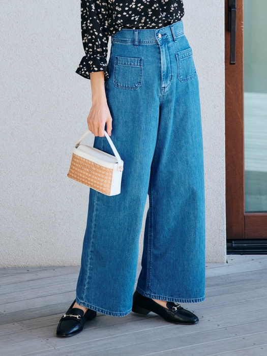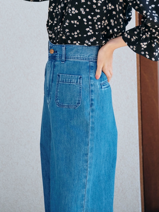 フロントに配したレトロな雰囲気のポケットがアクセントになったデニムマリンパンツ。トレンドのマリンルックを上品に表現してくれる1枚です。