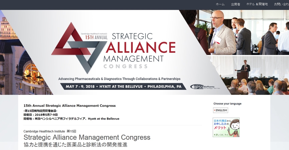先端分野の市場情報を提供する株式会社グローバル インフォメーション(神奈川県川崎市、代表取締役社長:小野 悟)は、2018年5月7-9日 米国、フィラデルフィアにて開催されますCambridge Healthtech Institute主催 国際学会 「15th Annual Strategic Alliance Management Congress-第15回戦略提携管理会議」の代理店として参加のお申込み受付を11月14日より開始致しました。