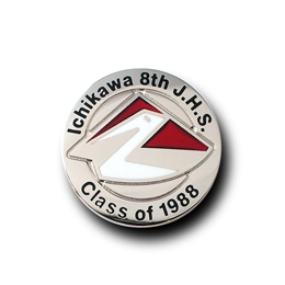 今回のご依頼で誕生したオーダーメイドグッズのモチーフは、身に着ける方々の中学時代が凝縮された象徴のようなアイテム。千葉県の市川市立第八中学校1988年卒同窓会様が、同窓会の出席者だけに配布される特別なバッジとして、デザインを母校の「第二校章」とお揃いにした作品は、「市川市立第八中学校1988年卒同窓会ピンズ」です。因みに皆さんと同じ時期を同校で過ごした生徒の中には当社のスタッフも含まれていました。