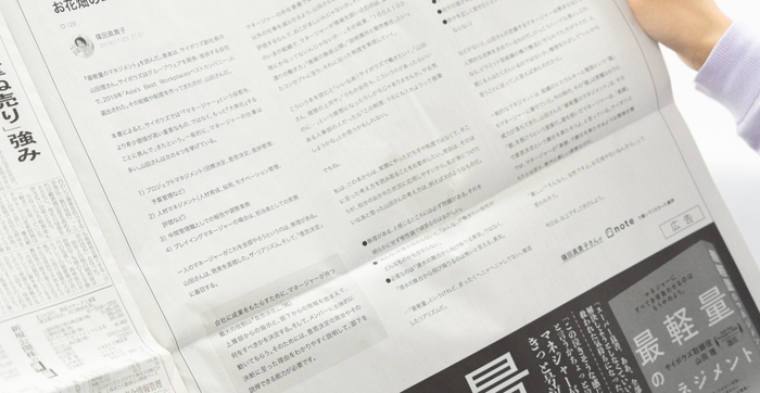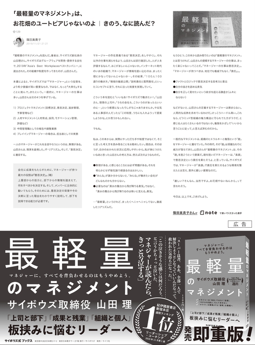 noteに篠田真貴子さんがつづった『最軽量のマネジメント』の書評が、日経新聞の全面広告(12月17日付)に掲載されました。『最軽量のマネジメント』は、サイボウズの出版事業として生まれた「サイボウズ式ブックス」から出版された第一弾の書籍で、出版までの経緯は「サイボウズ式ブックス編集部のnote」にもまとめられています。