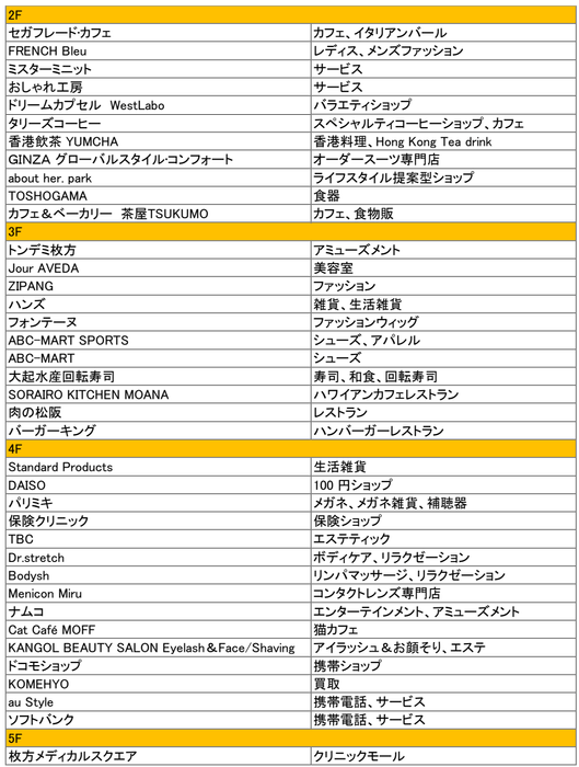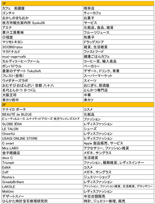 ■「枚方モール」店舗概要(一部抜粋、画像はイメージです)