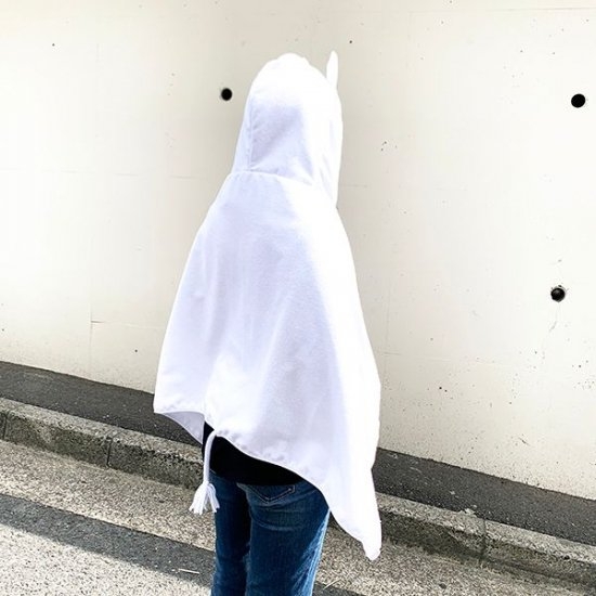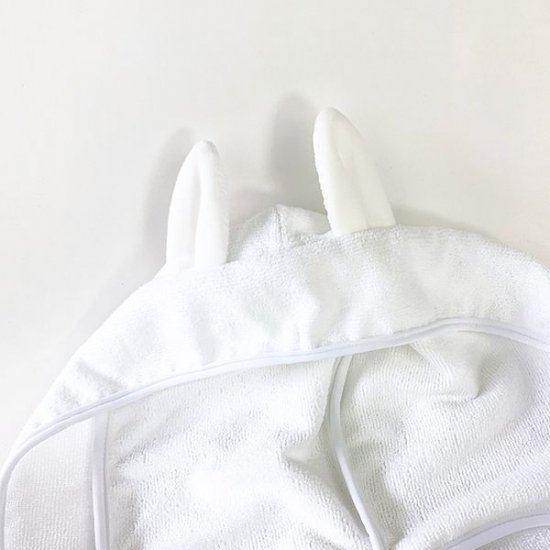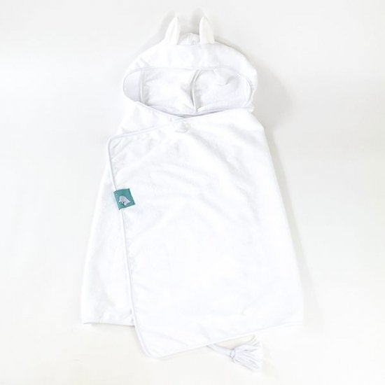 真っ白でふわふわな素材のタオルで、しかもフード付き。お風呂上がりに体を拭くだけでなく、羽織ることもできちゃいます。