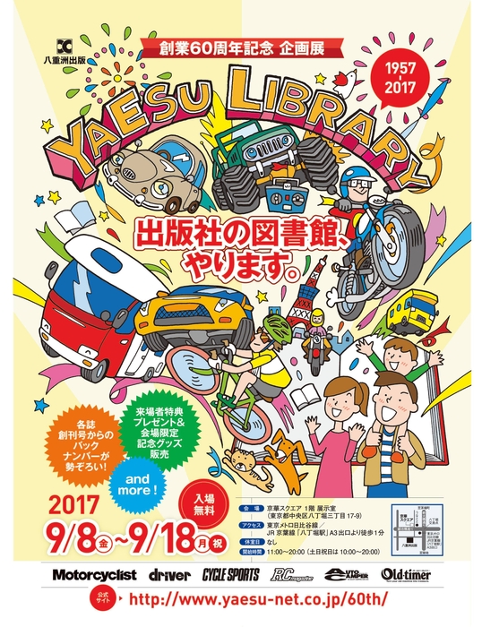 出版業を行う株式会社八重洲出版(本社:東京都中央区)は、2017年7月に創業60周年を迎えました。当社は創業から、バイク・クルマ・自転車などの趣味の雑誌を作り続けてきました。これまでずっと支えていただいた読者へ感謝を込めて、このたび八重洲出版創業60周年記念企画展「YAESU LIBRARY」を2017年9月8日(金)~18日(月・祝)の11日間にわたって開催いたします。期間中は、当社がこれまで発刊してきたバイク・クルマ・自転車・ラジコンなどの雑誌バックナンバーが手にとって閲覧できます。開催場所は、当社からもほど近い、東京都・八丁堀の京華スクエア1F展示室。入場は、無料です。