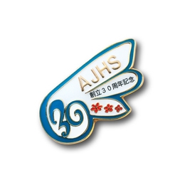力強い線で「翼」をイメージした完成品は、輪郭の鮮やかな青がピンズ全体を引き締めて、特色仕上げが品質の高さを前面に押し出します。清潔感あふれる白を背に英語表記の学校名や、「創立30周年記念」の8文字も入りました。皆さんの想いを実体化させたアニバーサリーピンズは、生徒と教職員に加えて式典の出席者にも配布され、見事な出来栄えには大きな喜びの声が上がったとか。学校が歩んだ30年の歴史に深く関わるアイテムをご提供出来たことは当社にとっての誇りでもあります。
