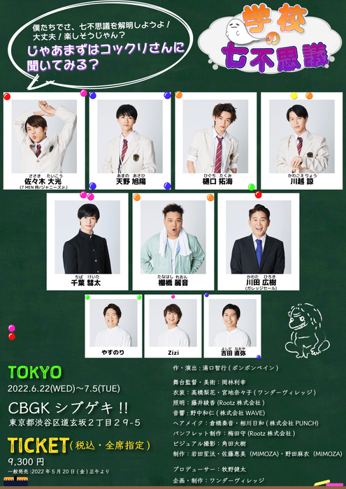 7 MEN 侍の佐々⽊⼤光主演、川⽥広樹(ガレッジセール)の出演が決定し、舞台「学校の七不思議」として、東京公演2022年6⽉22⽇(⽔)〜7⽉5⽇(⽕) CBGKシブゲキ!!にて上演する。