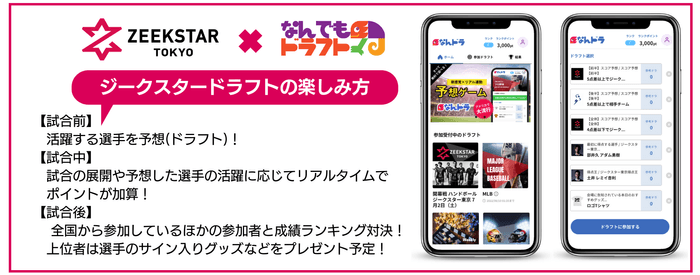 「ジークスタードラフト」ではゲーム参加者が試合の勝敗やスコア、チーム得点王などを予想して順位を競います。試合会場にいなくても参加でき、より多くのファンが試合の前から終わった後まで長く深く試合を楽しめます。