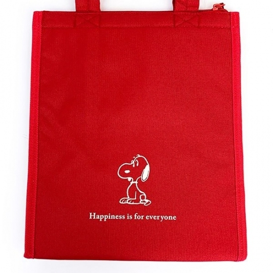 まずは、レッドカラーのオシャレなランチバッグをご紹介します。縦長のスクエアフォルムが使いやすい、シンプルデザインです。中央には、レトロ感のあるタッチのスヌーピーのデザイン。フレンチっぽい雰囲気が素敵です。