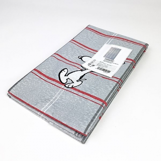 グレーの生地に赤の格子模様がオシャレな、スヌーピーのノレンです。