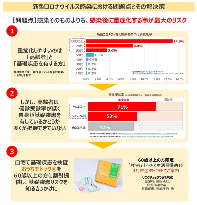 当社では、60歳以上の検診未受診者基礎疾患の把握に向けて、自宅で糖尿病や、心不全の遠因となる動脈硬化のリスク検査ができる、郵送型血液検査キット「おうちでドック 生活習慣病」を従来より販売しておりますが、本日から期間限定且つ、60歳以上の方に限り、通常価格より8%割引でキットを提供いたしますのでお知らせいたします。(2020年4月30日までの限定割引です)