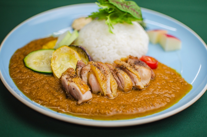 じっくりと焼き上げた軍鶏とスパイシーなカレーソースに、ぼたん胡椒のアクセントを効かせた大人の味わい。夏野菜の旨味も加わった本格的なカレーをお楽しみください。