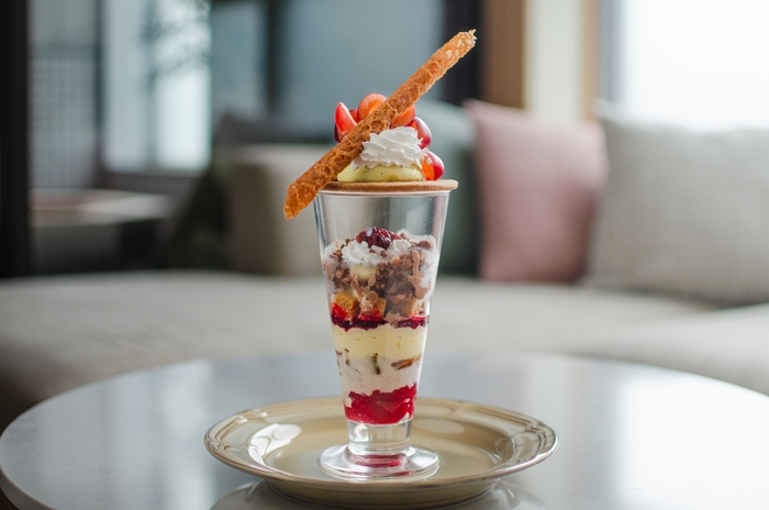 爽やかなジュレから濃厚なグラスバニーユまで、層ごとに異なる味わいと食感をお楽しみいただけます。甘酸っぱいさくらんぼとクリーミーなマスカルポーネが織りなす、至福のデザート体験をご堪能ください。