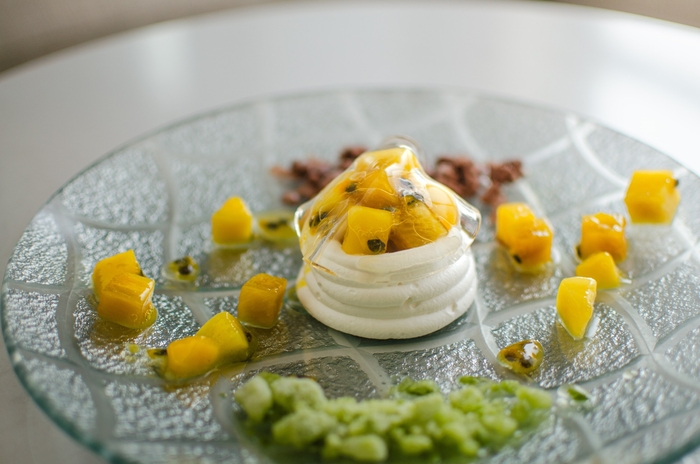 軽やかで繊細なメレンゲの器にトロピカルフルーツをたっぷりと盛り付けました。チョコレートとバジルの2種のグラニテが生み出す温度と食感のコントラストをお楽しみください。