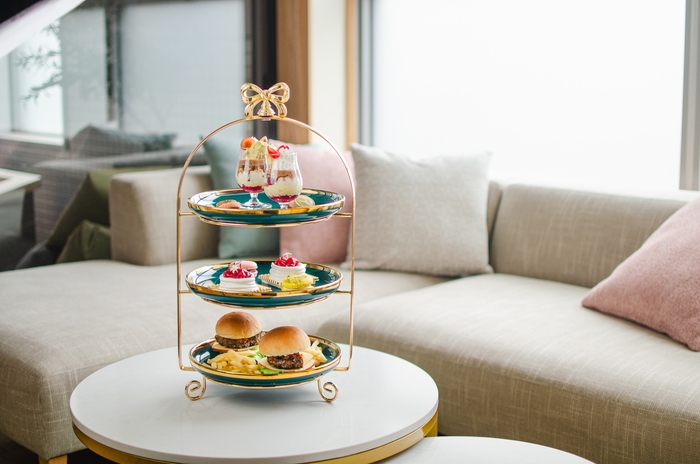 旬のさくらんぼとマスカルポーネのミニパフェをはじめ、選べるスイーツ)、信州牛ミニバーガーなど盛りだくさんのアフタヌーンティーセット。信州の豊かな恵みを贅沢に味わえる三段構成の特別体験をお楽しみください。