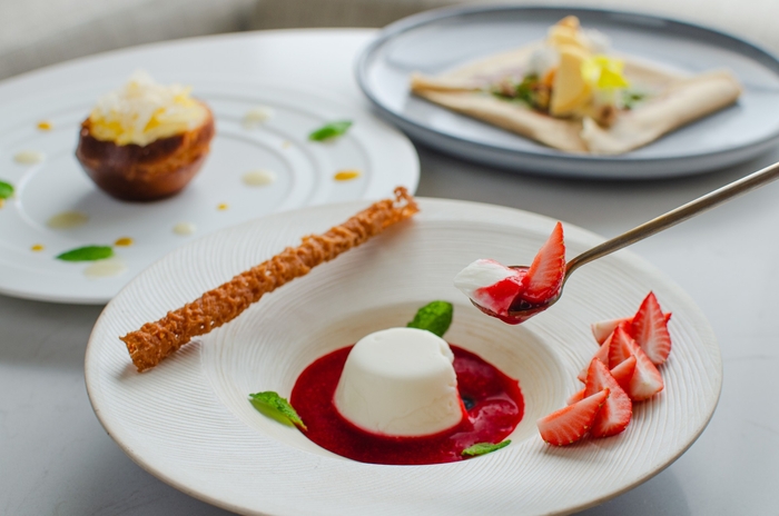 なめらかなブランマンジェ、香ばしいそば粉を使用したクレープ、ジューシーな柑橘サヴァランを組み合わせた特別コース。信州の豊かな自然の恵みを五感で堪能できる、贅沢なデザートストーリーをご提供いたします。