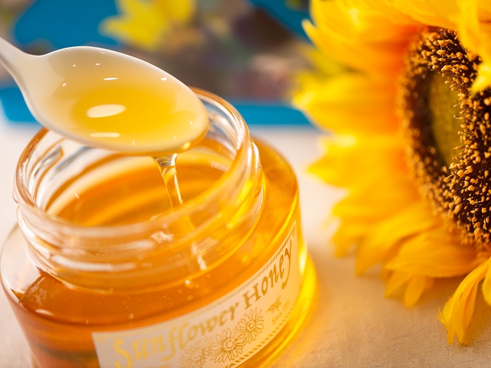 太陽を追いかけて咲くひまわりから採られるはちみつは、陽の光を集めたような目にも鮮やかな黄金色。