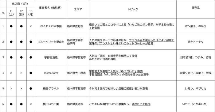 今回は、栃木県の米、フルーツ(ブルーベリー、レモン、いちご)、お酒の6生産者の今が旬の商品や、新春特別価格の商品、寒い冬にあたたかいメニューなど約40種類の商品をマルシェで販売いたします。