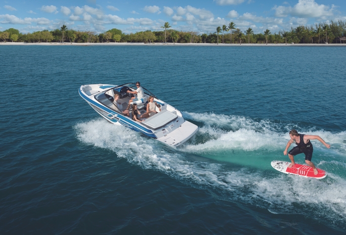 「REGAL 19 SURF」は、ボートを動かすことで発生する引き波を利用して波に乗る「ウェイクサーフィン」のみにとどまらず、新たな海への楽しみを求める層を魅了する、特別な価値創造をするボートとなってます。