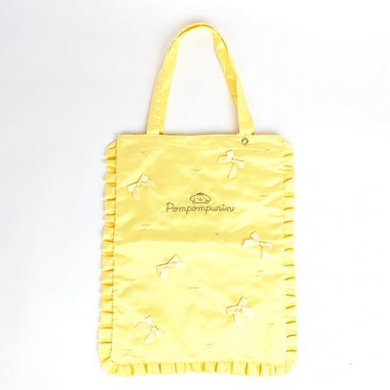 鮮やかなパステルイエローのこちらは、ポムポムプリンの刺繍デザインのトートバッグです。
