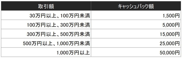 ・キャンペーン内容:取引額に応じて最大5万円をキャッシュバック