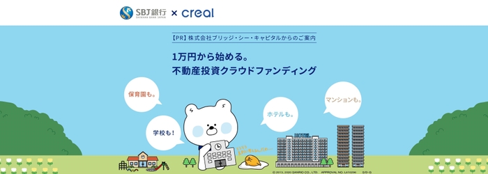 株式会社ブリッジ・シー・キャピタル(本社:東京都中央区、代表取締役社長:横田 大造、以下「当社」)は、株式会社SBJ銀行(本店:東京都港区、代表取締役社長:富屋 誠一郎、以下「SBJ銀行」)から、当社の運営する不動産投資クラウドファンディングサービス「CREAL」の紹介を行う、「SBJ銀行×CREAL」の取り組みにおいて、キャンペーンを実施することをお知らせいたします。両社は、2020年6月15日に業務提携契約※を締結しており、本キャンペーンによって、両社の取り組みをより加速させることを見込んでいます。