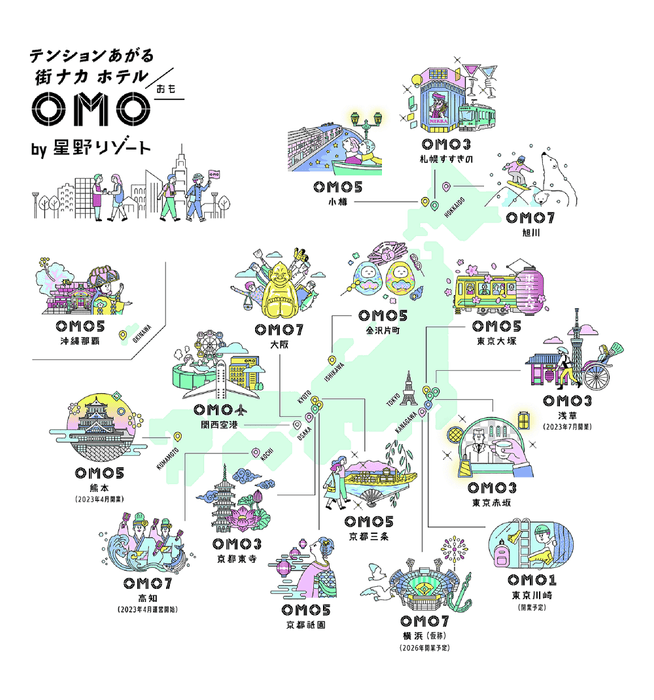 「OMO」は星野リゾートが全国に展開する「テンションあがる『街ナカ』ホテル」。地域と一体となって街を楽しみ尽くす旅を追求しています。全てのOMOで、街歩きをサポートするサービス「Go-KINJO」を展開。全国各地の14施設から都市観光の楽しさを発信していきます(2023年4月時点)。