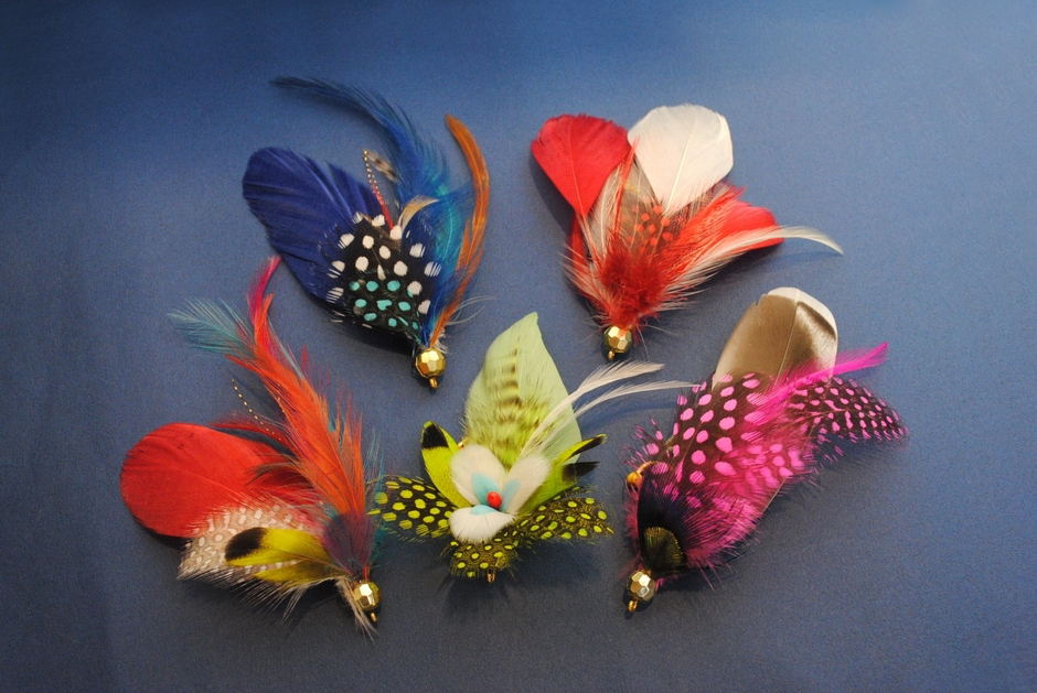 鮎を釣る加賀毛針は、川虫に似せるために色とりどりの羽毛で釣り針を飾ったもの。