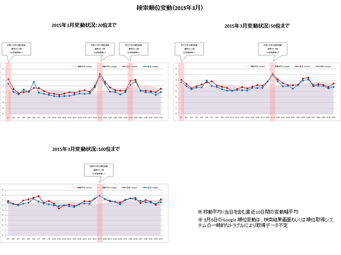 注目度の高いトピックが続いた2015年3月の順位変動状況は、月初と中旬に大規模な変動が確認されました。2015年4月以降にはGoogle 公式発表のアルゴリズム更新によって、インパクトの大きな変動が予想されています。検索ユーザーの市場がデスクトップPCとモバイルに大きく二分化する状況に応じて、今後、市場動向を把握するためには、デスクトップPCとモバイルの個別評価による各検索結果画面の変動を確認することが重要になっていきます。