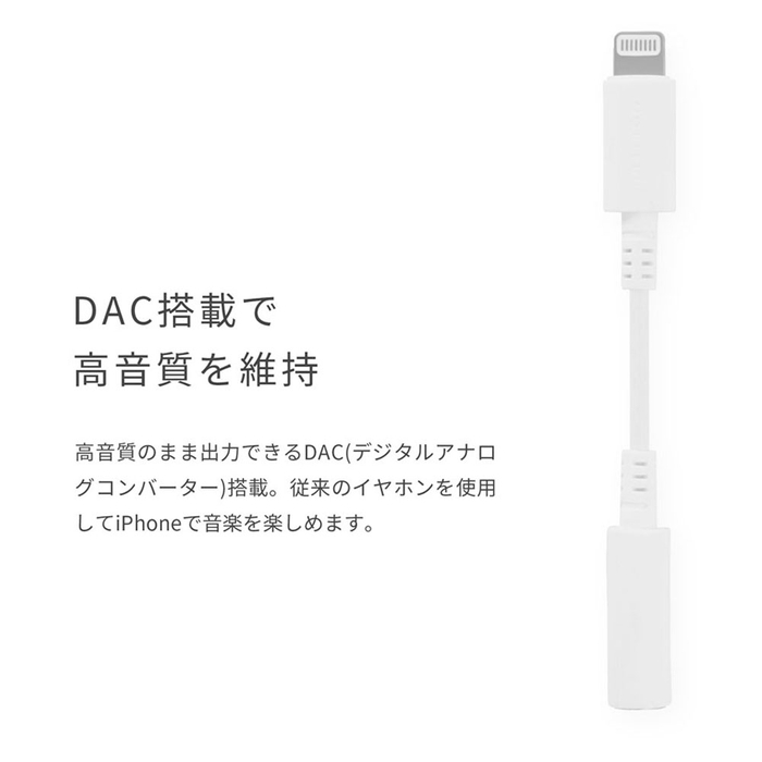 アダプタ内部にDACを搭載しているためノイズが少なく、高音質のまま音楽を聴くことが出来ます。