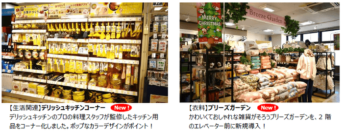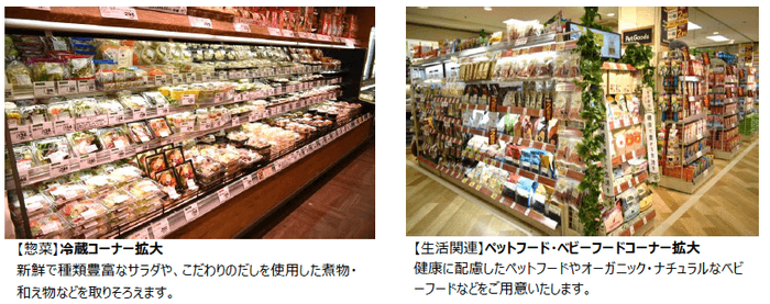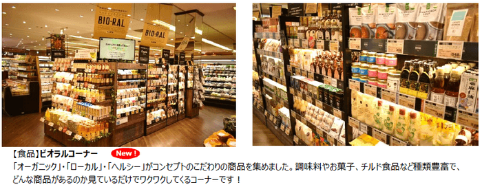 この度の改装で酒と冷凍食品コーナーを2階に移設し、食品の品ぞろえを拡充いたしました。さらに、健康志向の方におすすめの体に優しい商品を取りそろえた「ビオラルコーナー」を新設するなど魅力ある商品を多数取りそろえ、幅広いお客様にご満足いただけるお店を実現いたします。
