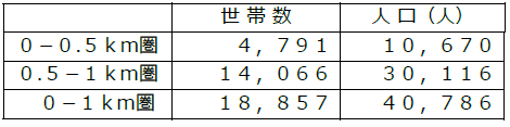 ・店舗から1km圏内は単身世帯比率が39.2%、2人世帯比率は28.3%と全体の7割弱が少人数世帯です。