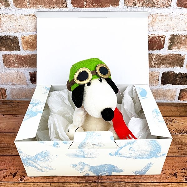 私たちの取り扱うスヌーピーのぬいぐるみは300種類に及びます。その中でも、こだわりと希少性は最上級。職人が1つ1つ手作りをした渾身のコレクションドールです。モチーフは、数あるスヌーピーのアートの中でも人気の高いフライング・エース。もちろん、ぬいぐるみのモチーフとして人気が高く、そして、シュタイフのスヌーピーとしては初の登場です。宿敵のレッドバロンと戦うべく、パイロット”フライング・エース”に扮したスヌーピーがおなじみの赤い屋根の犬小屋にまたがり、空想の中で大空を駆け巡ります。帽子やゴーグルは着脱可能(注1)なので、スヌーピーとしても飾れてしまいます。